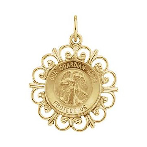 Polished solid 14k yellow guardian angel pendant has fancy scalloped edges. Dimensions: 18.5mm x 18.5mm. This item is slightly larger than a dime. Weight: 1.44 grams. Please note: weight is approximate, actual weight may vary. Chain not included.
