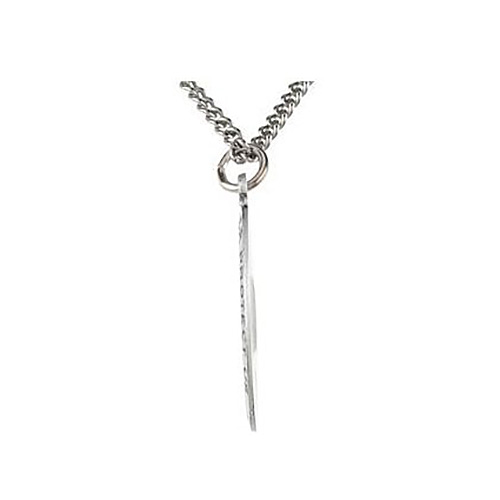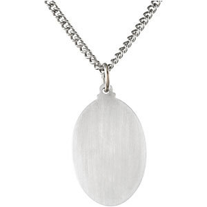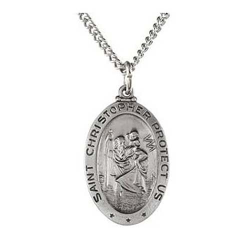 This men's oval St Christopher medal is made of antiqued sterling silver. 24-inch sterling silver endless curb chain. Dimensions: 25mm x 16mm. This item is the size of a quarter. Inscription: SAINT CHRISTOPHER PROTECT US. Die struck. Made in USA. Weighs 4.88 grams. Please note: weight is approximate, actual weight may vary.