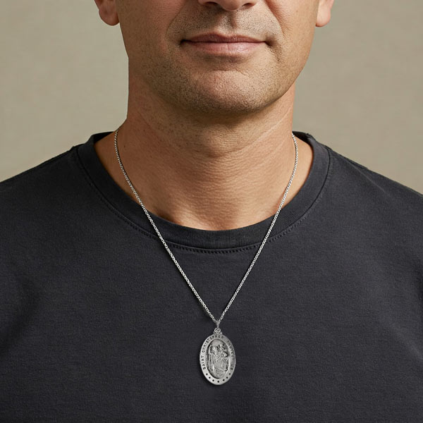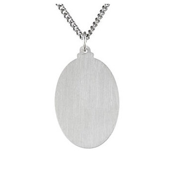 This men's St. Christopher medal necklace is oval and made of sterling silver. Inscription: SAINT CHRISTOPHER PROTECT US. Includes a 24-inch sterling silver endless curb chain (no clasp). Dimensions: 29mm x 20mm. This item is larger than a quarter. Weighs 13.78 grams. Please note: weight is approximate, actual weight may vary.
