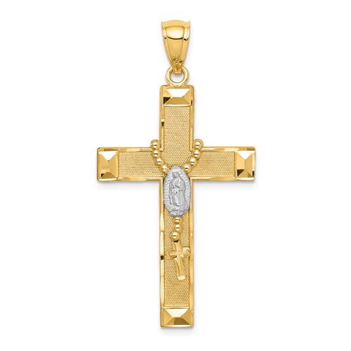 This large Latin cross with rosary pendant is made of 14k yellow gold and rhodium. Item height: 1 1/2in. Fits up to a 3mm wide chain. Weight: 2.84 grams. Made in the USA.