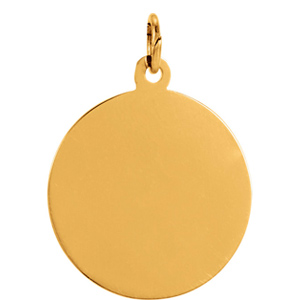 This small round St Christopher medal is made of polished solid 14k yellow gold. SAINT CHRISTOPHER PROTECT US. 18mm in diameter. The size of a dime, this religious pendant is appropriate for a lady or child to wear. A symbol of protection and devotion, this St Christopher medal is die struck with exquisite detail. The jump ring measures 2.3x2.5mm. We recommend a chain no wider than 2.0mm. Approximate weight: 2.05 grams. Made in USA. Carry your faith with you in style and sophistication.