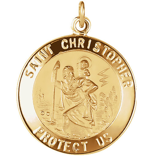 This round St. Christopher medal is made of solid polished 14k yellow gold. Dimensions: 20mm in diameter. This item is slightly larger than a penny. Inscription: SAINT CHRISTOPHER PROTECT US. The jump ring measures 2.3x2.25mm. We recommend a chain no wider than 2.0mm. Approximate weight: 2.4 grams. Made in USA.