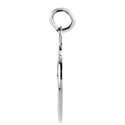This petite round St Christopher medal is made of polished 14k white gold. Dimensions: 15mm in diameter. This medal is smaller than a dime. SAINT CHRISTOPHER PROTECT US. The jump ring measures 1.7x2.0mm. We recommend a chain no wider than 1.5mm. Weighs 1.25 grams. Please note: weight is approximate, actual weight may vary. Chain not included.