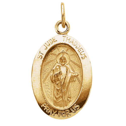 This small oval St Jude medal is made of polished 14k yellow gold. This item is smaller than a dime. Dimensions: 15x11mm. Weighs .93 grams. Please note: weight is approximate, actual weight may vary. Chain not included.
