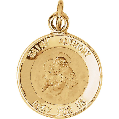 This very small Saint Anthony medal is made of solid polished 14k yellow gold. Dimensions: 15mm diameter. This item is smaller than a dime. Weighs .83 DWT (1.29 grams). Please note: weight is approximate, actual weight may vary. Chain not included. St. Anthony of Padua was a Franciscan preacher who lived in the 13th century. Widely known as the saint who helps people find lost objects.