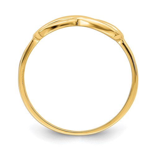 This infinity ring is made of 14k yellow gold. Infinity symbol size: 15.3mm x 5.6mm. Ring size 7 approximate weight: 1.36 grams. Made in USA. Standard fit.