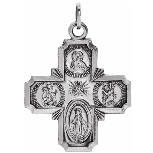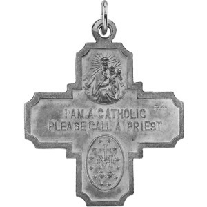 This small solid 14k white gold four way medal has a polished and satin finish. Dimensions: 18x18mm. This item is the size of a dime. Rhodium-plated. Also known as a cruciform, it is actually four medals in one: The Sacred Heart at the top; St. Christopher on the right; Miraculous at the bottom; and St. Joseph on the left. The words "I am a Catholic, please call a priest" are inscribed on the back to indicate to a first responder the wearer's desire for the last sacraments. Approximate weighs 1.86 grams. Made in USA.