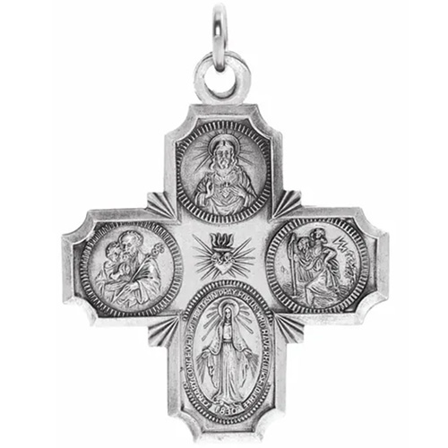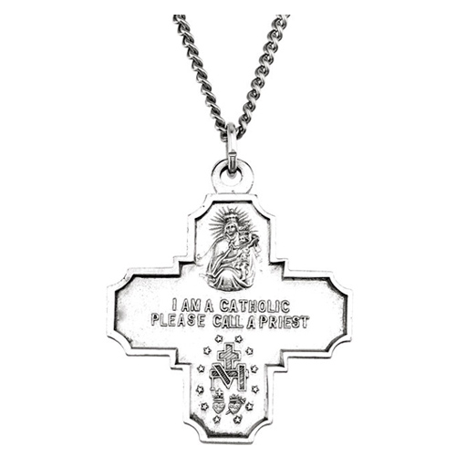 Four way medal is made of polished and antiqued sterling silver. 24-inch sterling silver continuous curb chain has no clasp. Medal dimensions: 30x29mm. This item is larger than a quarter. Approximate weight: 13.0 grams. Also known as a cruciform, it is actually four medals in one: The Sacred Heart at the top; St. Christopher on the right; Miraculous at the bottom; and St. Joseph on the left. The words "I am a Catholic, please call a priest" are inscribed on the back to indicate to a first responder the wearer's desire for the last sacraments.