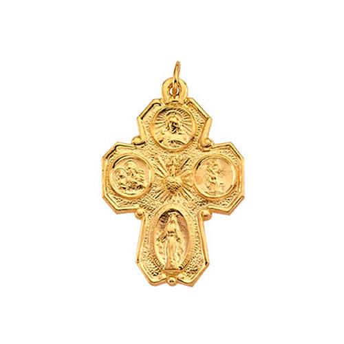 Four way medal is made of polished solid 14k yellow gold. Dimensions: 28x21mm. This item is slightly larger than a quarter. No inscription on back. Weighs 6.02 grams. Please note: weight is approximate, actual weight may vary. Chain not included. Also known as a cruciform, it is actually four medals in one: The Sacred Heart at the top; St. Christopher on the right; Miraculous at the bottom; and St. Joseph on the left.