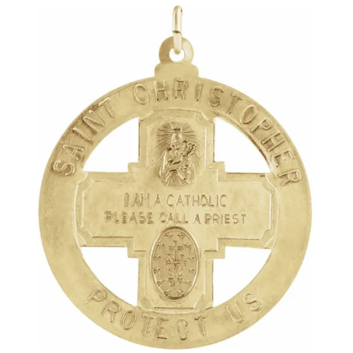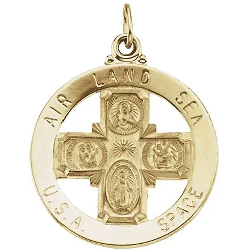 This round air, land, sea and space four way medal is made of polished 14kt yellow gold. Dimensions: 32mm diameter. Weighs 7.34 grams. Also known as a cruciform, it is actually four medals in one: The Sacred Heart at the top; St. Christopher on the right; Miraculous at the bottom; and St. Joseph on the left. The words "I am a Catholic, please call a priest" are inscribed on the back to indicate to a first responder the wearer's desire for the last sacraments.