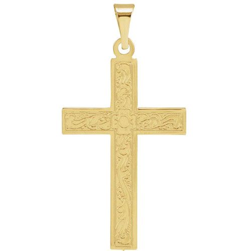 This ladies' ornate cross pendant is made of polished solid 14k yellow gold. Engraved grapevine design. Dimensions: 22mm x 14mm. This cross is the size of a nickel. Fits up to a 2mm wide chain. Weight: 0.89 grams. Please note: weight is approximate, actual weight may vary. Chain not included.