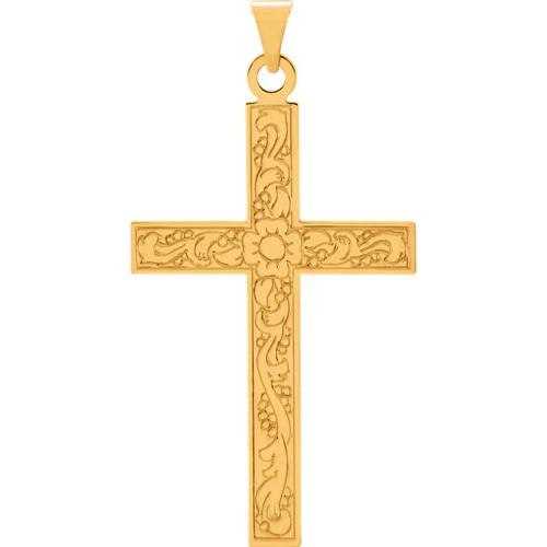 This large solid 14k yellow gold cross pendant has an engraved grapevine design. Dimensions: 39mm x 25mm. This cross is larger than a half dollar. Fits up to a 3mm wide chain. Approximate weight: 2.46 grams.