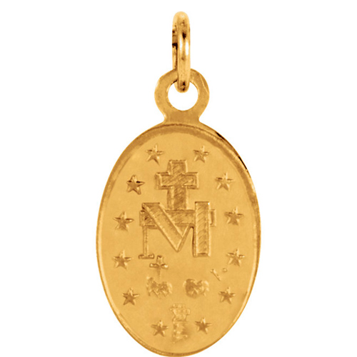 This small miraculous medal charm is die struck and composed of solid, polished 14kt yellow gold. Dimensions: 12mm by 8mm. Weighs .64 grams. This petite item is half the height of a quarter. The back of medal features an M, surmounted by a cross, with 2 hearts and 12 stars. Chain not included.
