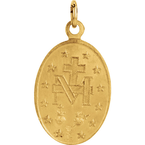 This oval 14k yellow gold miraculous medal pendant has a polished bright finish. Dimensions: 15.00mm by 10.00mm. This item is smaller than a dime. The back of medal features an M, surmounted by a cross, with 2 hearts and 12 stars. Weighs 1 gram. Bail dimensions: 2.3mm x 2.5mm. Chain not included.