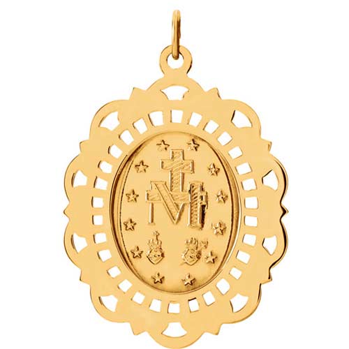 Filigree miraculous medal is made of polished 14k yellow gold. Dimensions: 22mm by 15mm. Weighs 1.54 grams. This item is the height of a nickel. Chain not included. Jump ring dimensions: 2.5mm x 2.5mm. We recommend a chain no wider than 2mm. The back of this miraculous medal has stars and a cross. Made in USA.