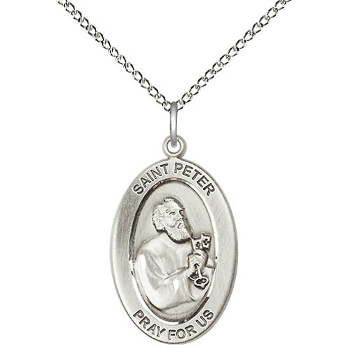 This ladies' oval sterling silver St Peter medal dangles from a slender sterling silver 18in curb chain with lobster clasp. Inscription: SAINT PETER PRAY FOR US. Medal size: 7/8in x 3/4in. This item is the size of a nickel. Made in USA.