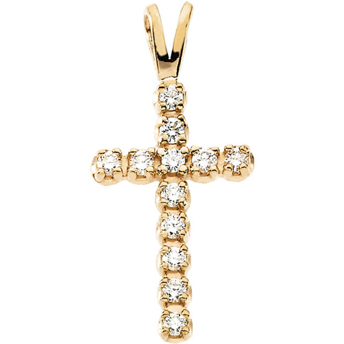12 diamonds grace this 14k yellow gold cross pendant. Diamond details: .12 ct tw. .01 CT each, full cut, round faceted. Diamond color: H-I, clarity SI1. This item is smaller than a dime. Dimensions: 15mm x 11mm. Chain not included.