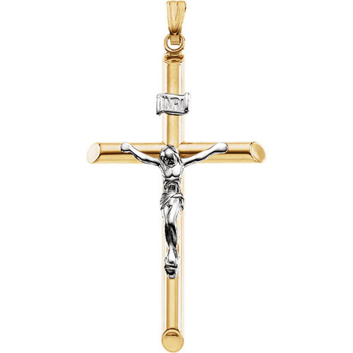 This large beveled INRI crucifix pendant is made of polished 14k two-tone gold. Dimensions: 37x23mm. Hollow center. Weight: 1.21 grams. Please note: weight is approximate, actual weight may vary. We recommend a chain no wider than 2.5mm. Tapered bail. Available while supplies last.