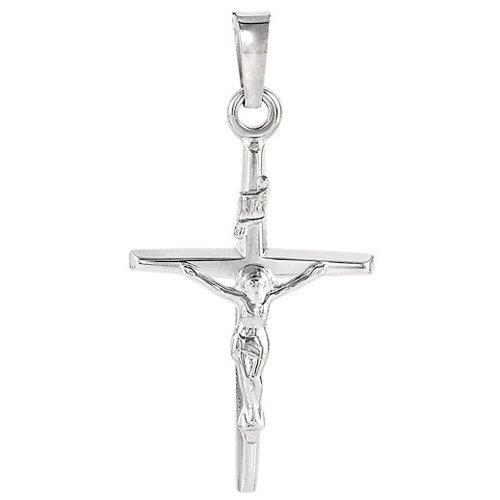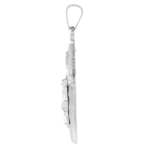 INRI crucifix pendant is made of polished solid 14k white gold. Finely detailed. Dimensions: 21mm x 14.5mm. This item is slightly smaller than a nickel. Rhodium-plated. Approximate weight: 1.34 grams. Fits up to a 3mm wide chain.