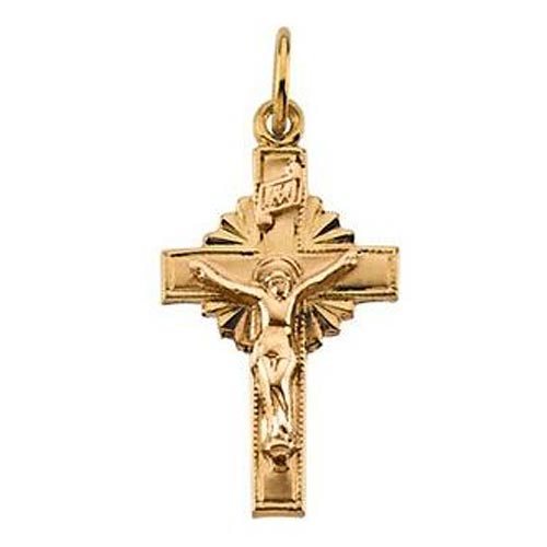 This ladies' small crucifix pendant is made of 14k yellow gold. Finely detailed with sunburst design. Hollow center. This item is smaller than a dime. Approximate weight: 0.75 grams. Bail dimensions: 2.3mm x 2.75mm. Fits up to a 2mm wide chain. Made in USA.