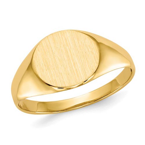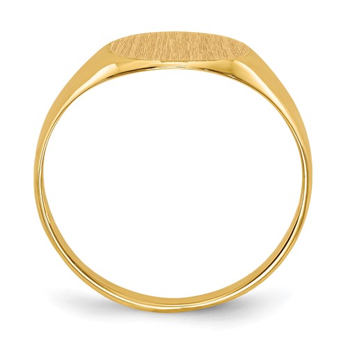 14k yellow gold ladies' classic oval signet ring has a brushed finish on top with polished sides. Open back. Top width: 8.6mm, palm width: 2mm. Weight: 1.6 grams. Made in the USA.