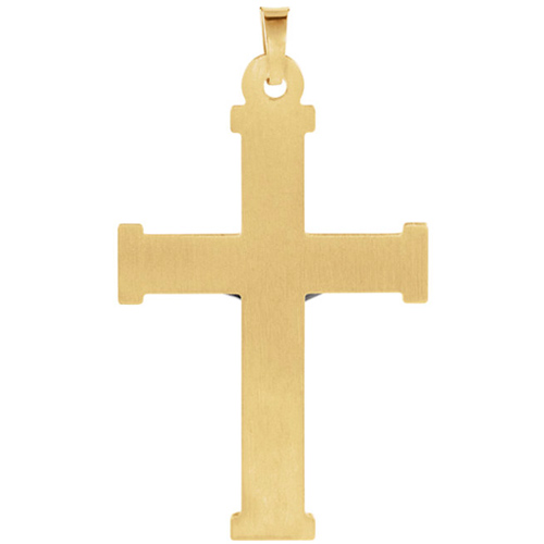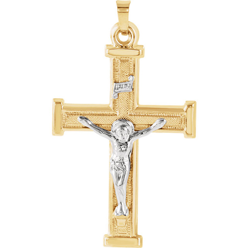 Hollow INRI crucifix cross is made of polished 14k two tone gold. This crucifix has bars on its tips. Item size: 32mm x 23mm. Approximate weight: 1.80 grams. Fits up to a 3mm wide chain. Made in USA.