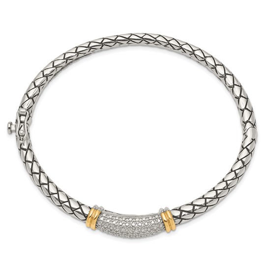 Sterling silver 1/5 carat diamond bangle bracelet has 14k yellow gold accents. Length: 7 inches. Width: 8mm. Safety clasp and hidden catch. Weight: 20.4 grams. Made in Thailand.