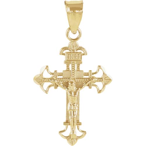 This ladies' fleur de lis INRI crucifix is made of solid 14k yellow gold. Dimensions: 19mm x 14mm. This item is the size of a penny. Fits up to a 3mm wide chain. Polished finish. Approximate weight: 1.20 grams.