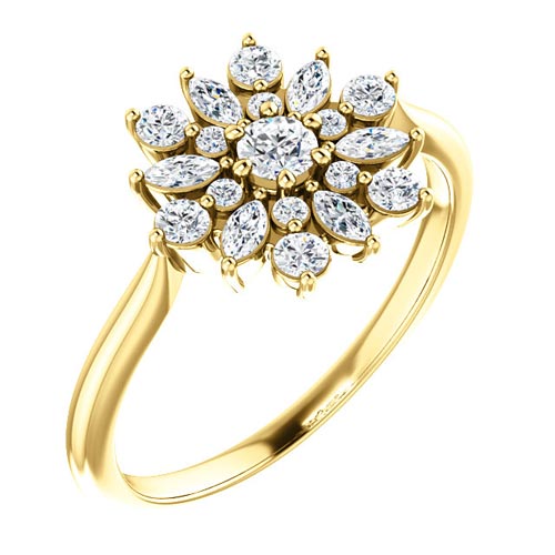 14k yellow gold 1/2 carat diamond ring has a starburst cluster of diamonds. Diamond details: 19 round and marquise cut diamonds, I1 clarity, G-H color. Weighs 2.9 grams. Please note: weight is approximate, actual weight may vary.