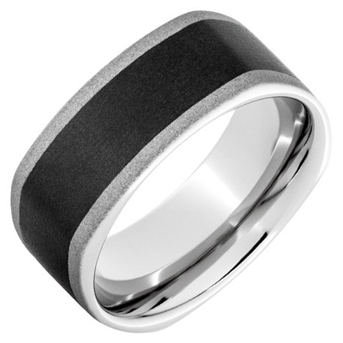 Serinium ring has a square shape and black ceramic inlay. Sandblast finish. Ring width: 8mm. Hypoallergenic and scratch resistant. Made in USA.