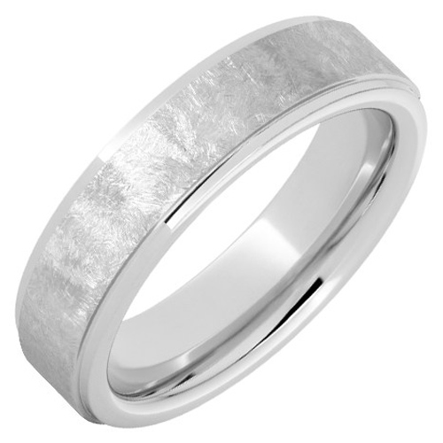 Serinium ring has a sentinel finish and and grooved edges. Ring width: 8mm. Comfort fit. Hypoallergenic and scratch resistant. Made in USA.
