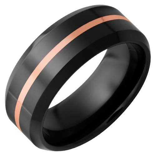 Black ceramic ring has a thin rose gold inlay. Flat center. Ring width: 8mm. High polished finish. Comfort fit. Hypoallergenic and scratch resistant. Made in USA.