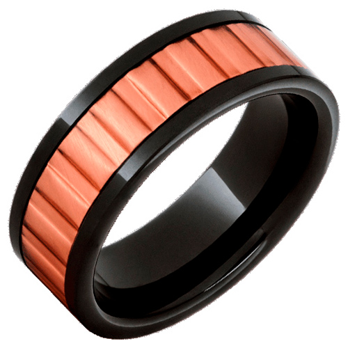 Black ceramic ring has a copper inlay. Flat center. Ring width: 8mm. The 5mm wide copper inlay is protected by a layer of durable resin. High polished finish. Comfort fit. Hypoallergenic and scratch resistant. Made in USA.