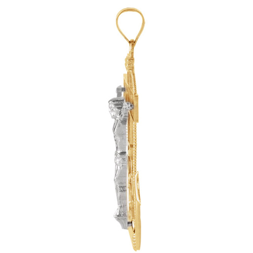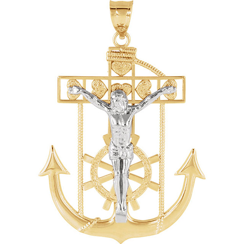 This extra large mariner's cross pendant is made of polished 14kt two tone gold. Suitable for a man to wear. Finely detailed mariner's design. Dimensions: 46.5x38mm. Weight: 9.41 grams. Please note: weight is approximate, actual weight may vary. Chain not included.
