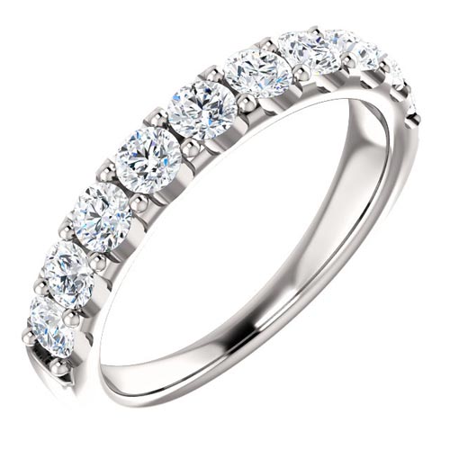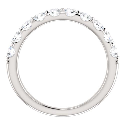 This 1 ct shared prong diamond anniversary ring is made of platinum. Diamond details: 10 round 3.0mm full cut diamonds, G-H color, SI2-SI3 clarity. Ring top width: 3.5mm. Size 7 approximate weight: 5.8 grams. Standard fit. Available in finger sizes 6-8. Made in the USA.