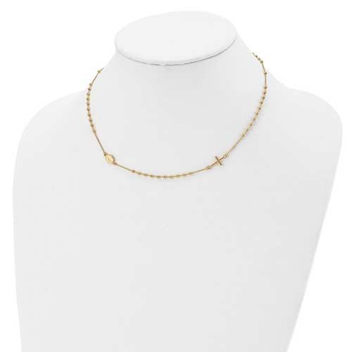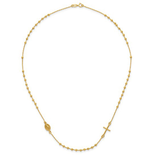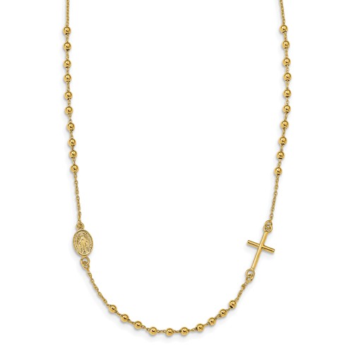 14k yellow gold rosary and sideways cross necklace has a spring ring clasp. 16.5 inch cable chain has bead accents. Weight: 2.2 grams. Made in Italy. Ships from USA.