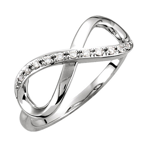 .05 ct tw diamond infinity ring is handcrafted in solid 14k white gold. Top width: 7.8mm. Palm width: 2.45mm. Set with 11 round diamonds, I1 clarity, G-H color. Weight: 2.3 grams.
