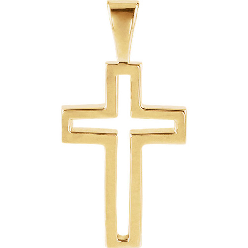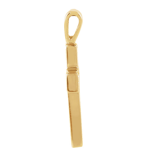 This very small cut-out Latin cross is made of polished solid 14k yellow gold. Dimensions: 13.5mm x 9.5mm. This item is smaller than a dime. Bail size: 2.2mm x 1.25mm. We recommend a chain no wider than 1mm. Approximate weight: 0.87 grams.