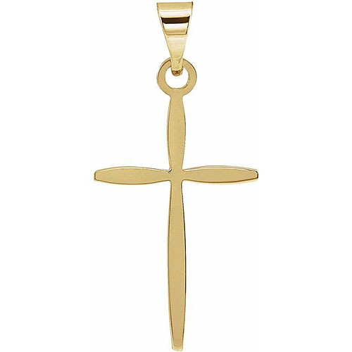 This small tapered cross pendant is made of polished solid 14k yellow gold. Dimensions: 17x11mm. This item is slightly smaller than a dime. Bail size: 2.25 x 3.25mm. We recommend a chain no wider then 2.00mm. Approximate weight: 0.26 grams.