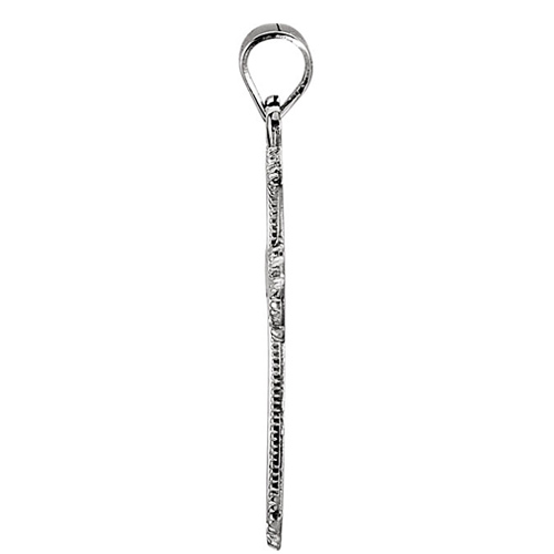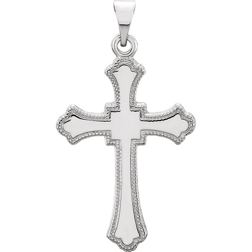 This small 14k white gold budded cross features a beaded finish along the edges. Dimensions: 15mm x 11mm. This item is smaller than a dime. Weight: 0.55 grams. Please note: weight is approximate, actual weight may vary. Chain not included.