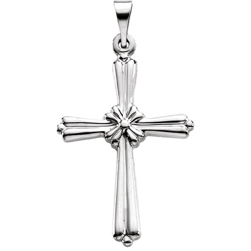 This large polished floral cross pendant is made of solid 14k white gold. Dimensions: 35 x 25.5mm. This item is larger than a half dollar. Weight: 4.04 grams. Please note: weight is approximate, actual weight may vary. Chain not included.