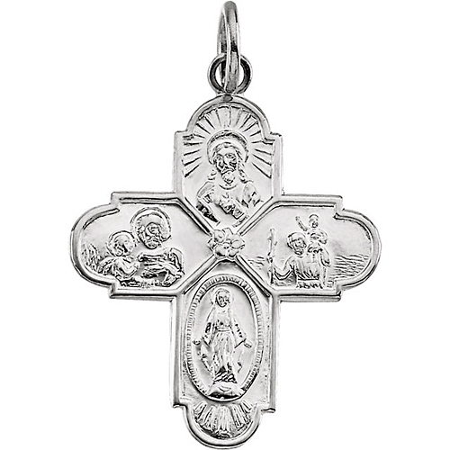 14k white gold four way medal has a slender profile. Pendant size: 3/4in x 1in. No inscription on the back. Weight: 2.2 grams. Please note: weight is approximate, actual weight may vary. Fits up to a 3.75mm wide chain. Made in the USA.