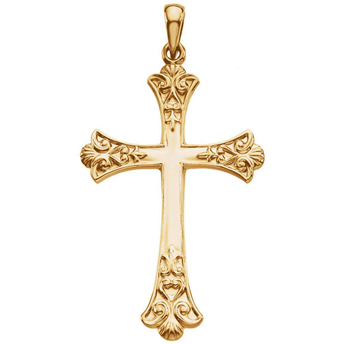 Polished 14k yellow gold fleur de lis cross is larger than a half dollar. Dimensions: 38x26mm. Weight: 3.73 grams. Please note: weight is approximate, actual weight may vary. Chain not included. We recommend a chain no wider than 2.5mm.