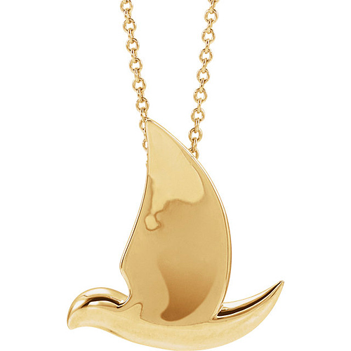 Holy spirit dove necklace is made of polished 14k yellow gold. Pendant size: 5/8in x 3/4in. 14k yellow gold adjustable 16 to 18 inch cable chain has a spring ring clasp. Chain width: 1mm. Weight: 4.0 grams. Please note: weight is approximate, actual weight may vary. Made in the USA.