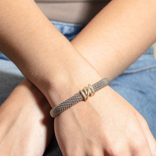 Phillip Gavriel sterling silver popcorn cuff bangle bracelet has .13 carat total weight diamond accents. 18k yellow gold coil accent. One size fits most women. Bracelet width: 7mm. Diamond clarity SI1, color G-H. The bracelet has a polished finish. Made in Italy.