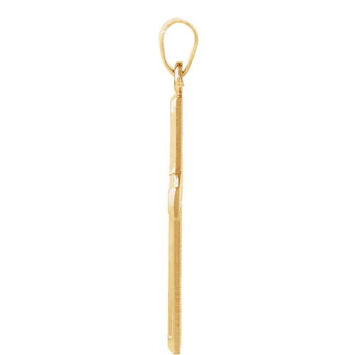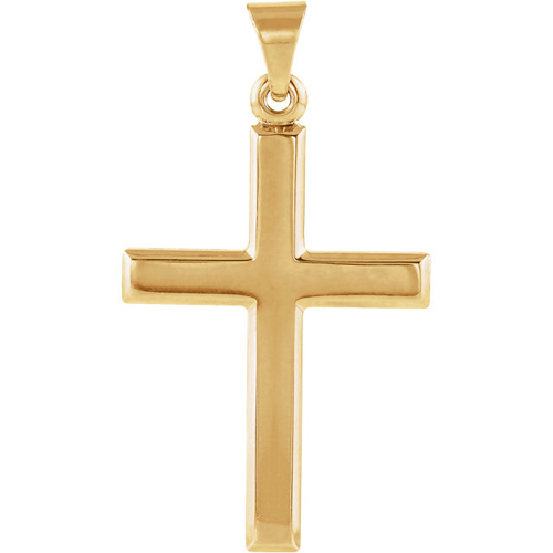 Polished and beveled cross pendant is made of 14k yellow gold cross. Hollow. Dimensions: 26x19mm. Thickness: 1.13mm. Weight: 2.16 grams. Please note: weight is approximate, actual weight may vary. Chain not included. We recommend chain width up to 3mm. Bail is 3x4mm.