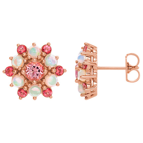 14k rose gold Swarovski pink topaz and Ethiopian opal cabochon earrings have a cluster design. Earring size: 1/2in. Weighs 4.1 grams. Please note: weight is approximate, actual weight may vary.