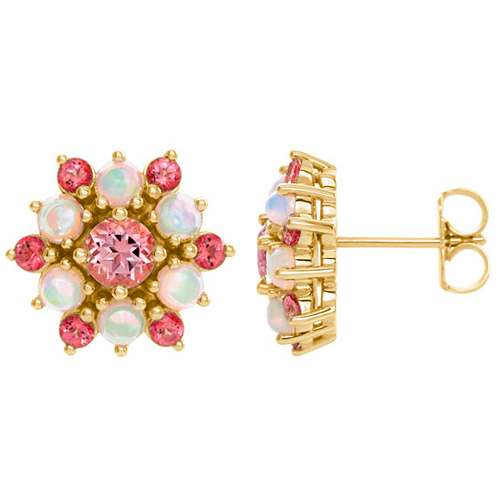 14k yellow gold Swarovski pink topaz and Ethiopian opal cabochon earrings have a cluster design. Earring size: 1/2in. Posts. Weighs 4.1 grams. Please note: weight is approximate, actual weight may vary.