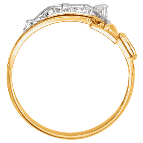 This men's crucifix ring is made of polished 14k two-tone gold. Size 11 only. Dimensions: 16.75mm width. Weight: 4.20 grams. Please note: weight is approximate, actual weight may vary.