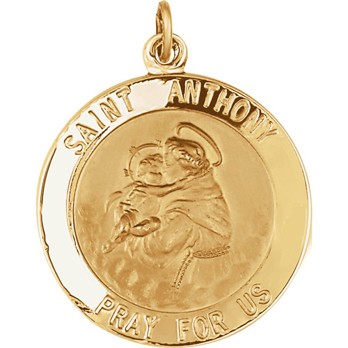 This round St Anthony medal is made of solid 14k yellow gold. Polished finish. Dimensions: 22mm. This item is the size of a nickel. Weighs 3.27 grams. Please note: weight is approximate, actual weight may vary. Chain not included. St. Anthony of Padua was a Franciscan preacher who lived in the 13th century. Widely known as the saint who helps people find lost objects.